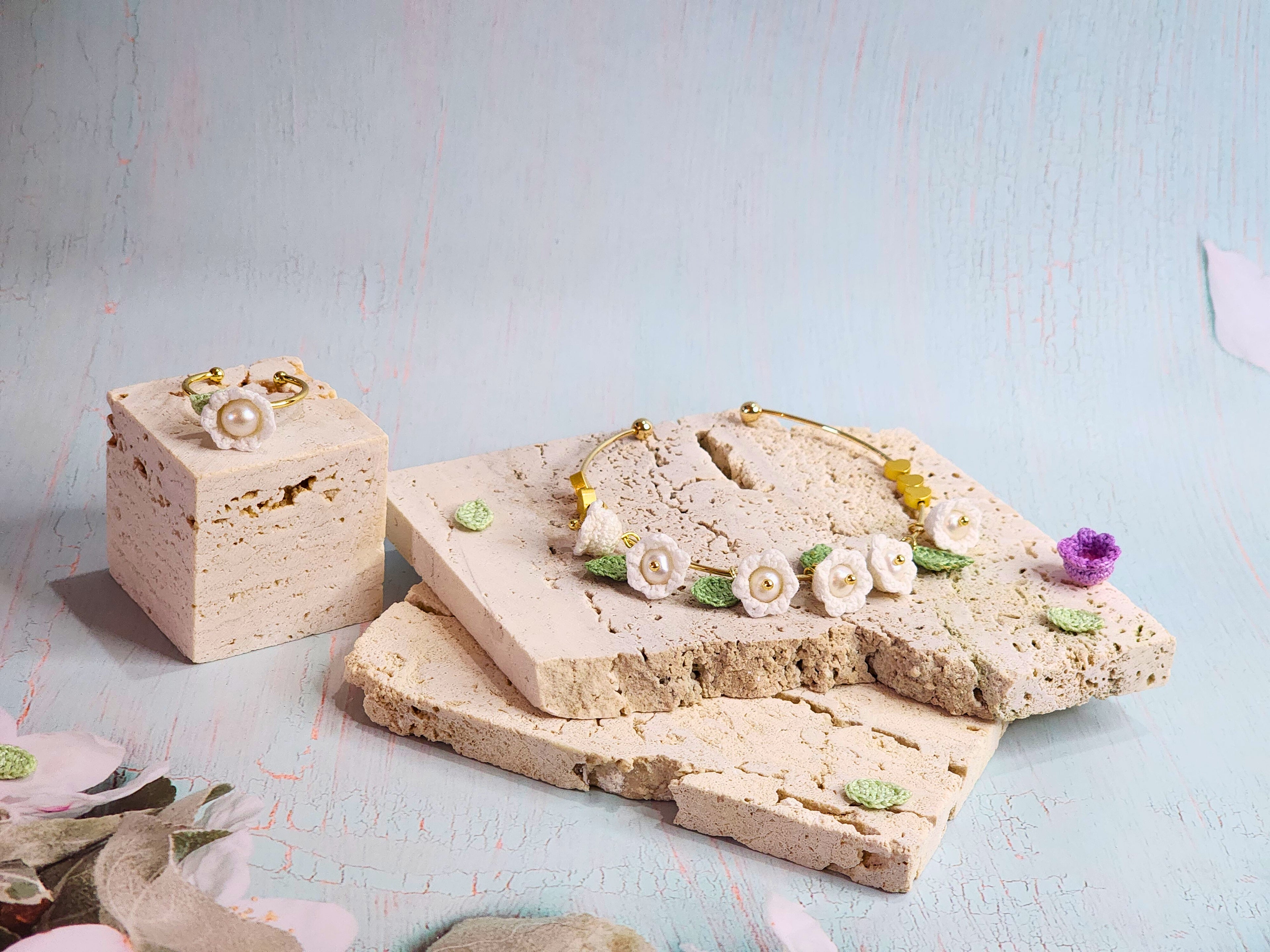 Pink-White Micro-crochet Lilies of the Valley with Pearls RingRegular price $33.00 USDRegular priceUnit price / per-