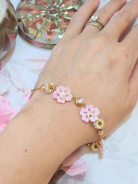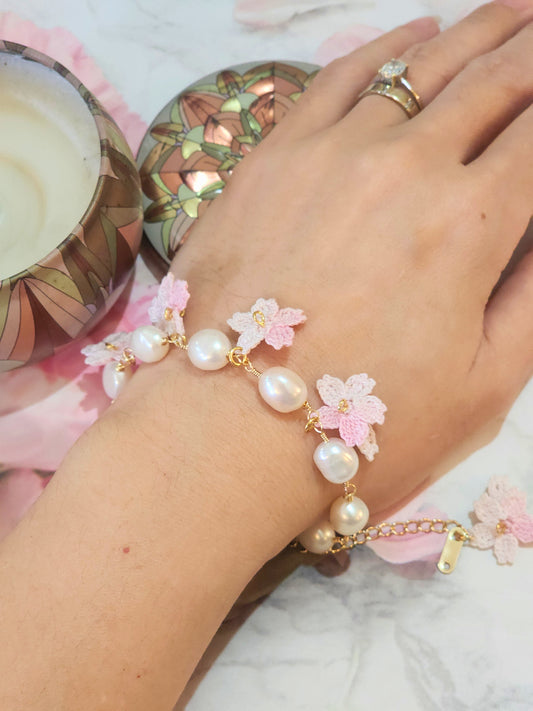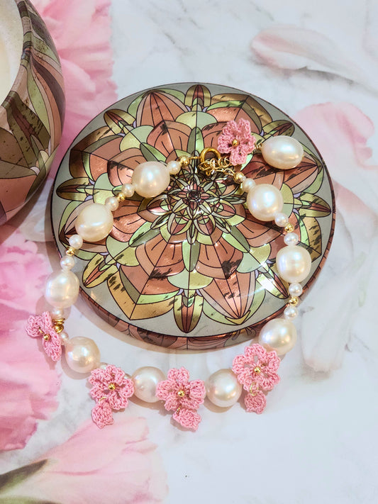 Baroque Pearls Bracelet with Micro-crochet Pink Sakuras