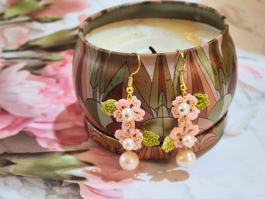 Micro-crochet Sakura with Pearls Dangle Earrings