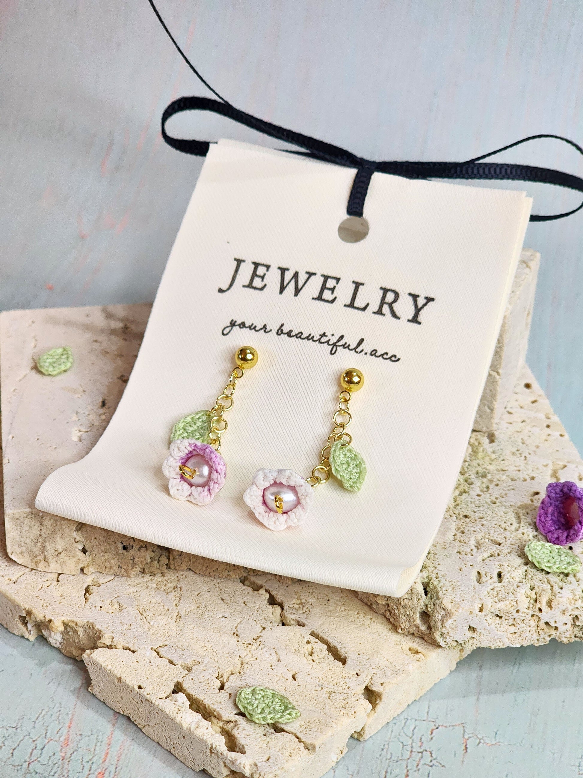 A simple yet enchanting pair of micro‑crochet Lily of the Valley with Pearls earrings. Delicately handcrafted blossoms are adorned with a 4.5–5mm natural freshwater pearl, set with 18K gold‑plated ear studs and chain.