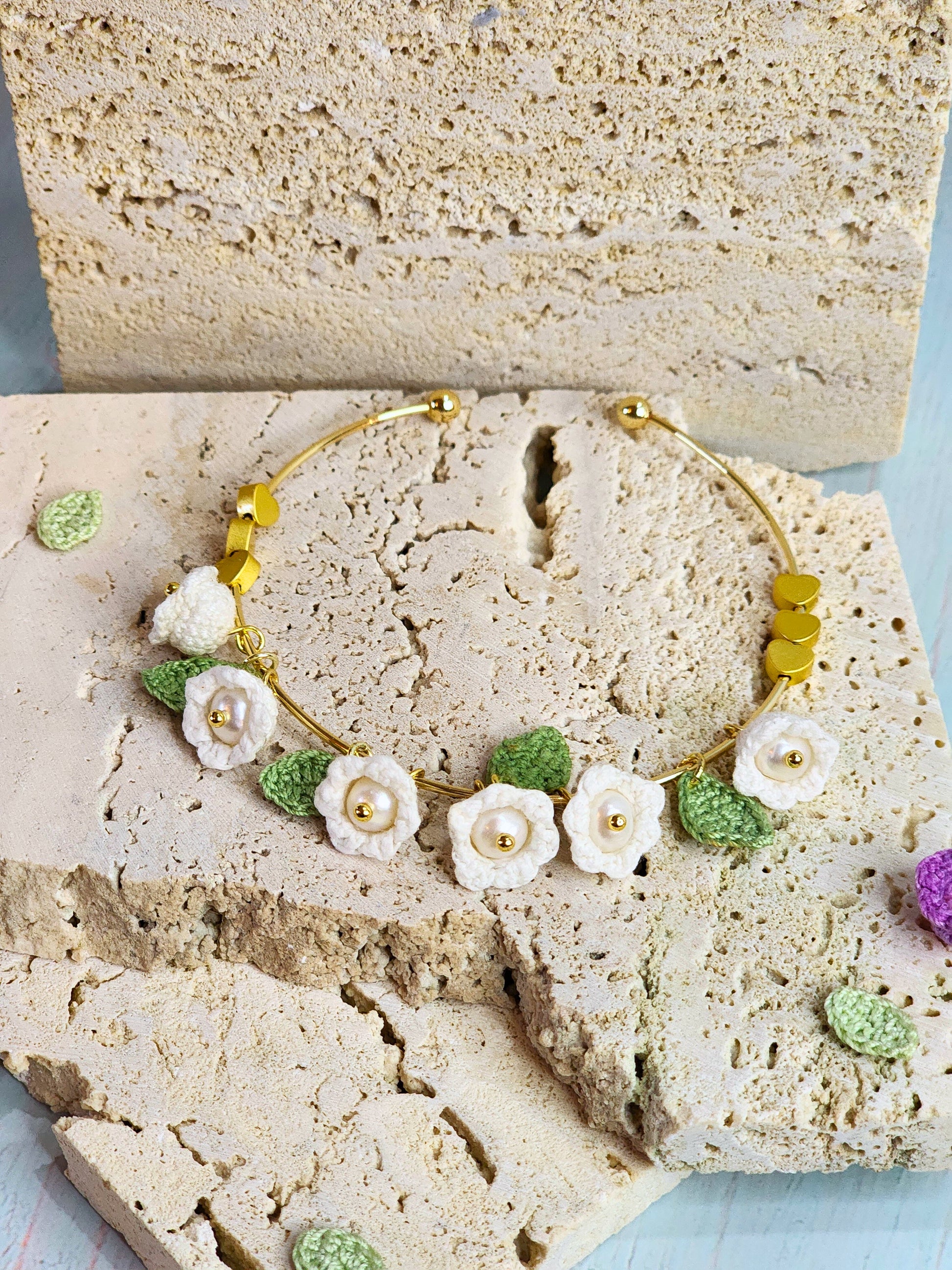 A graceful and elegant bangle of white micro‑crochet Lilies of the Valley, 18K gold-plated heart spacers, and artisan crafted blossoms, each adorned with a 4.5-5mm natural freshwater pearl. Gracefully set on a 18K gold-plated bangle.