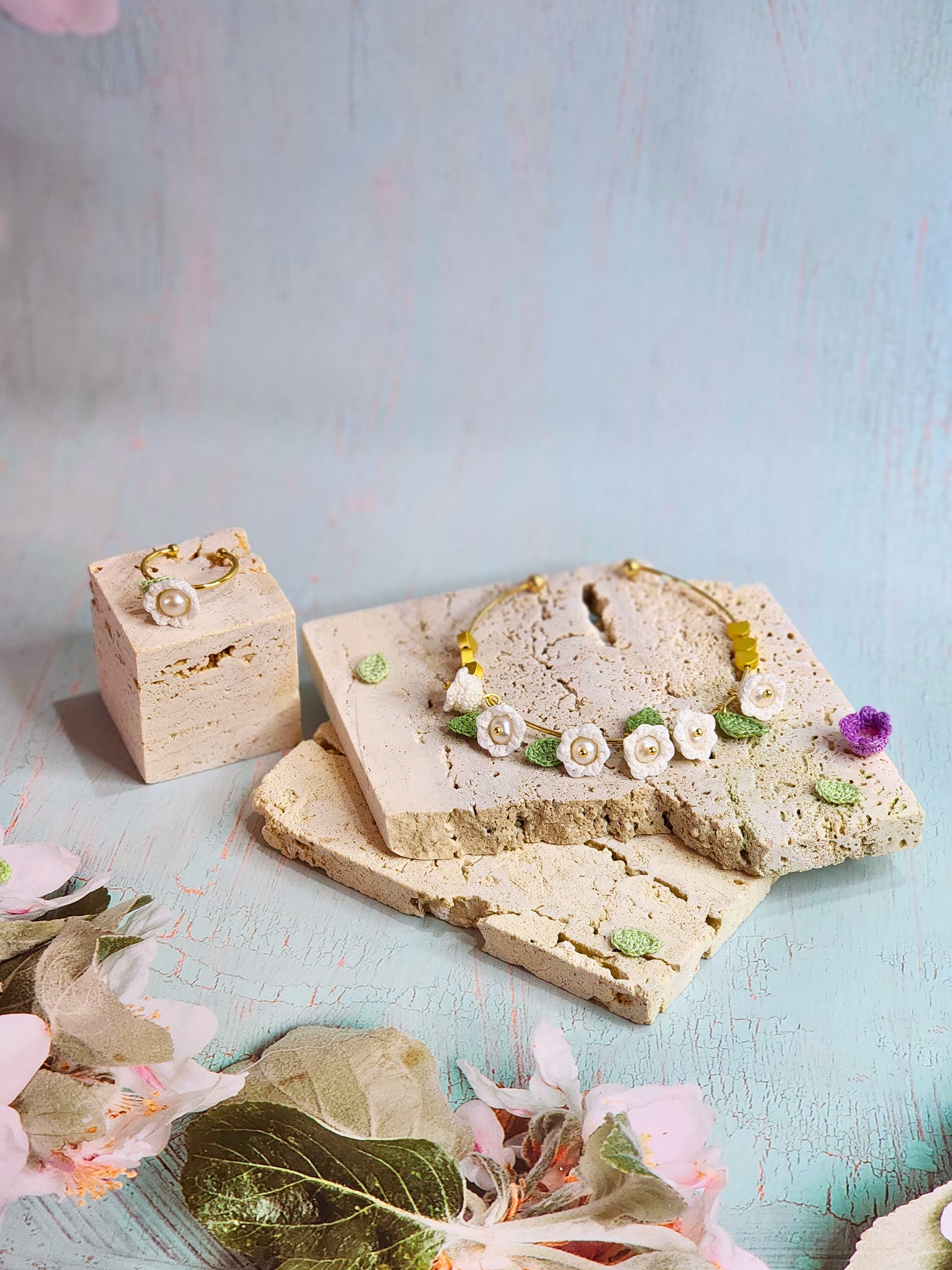 Complete your look with our White Micro-crochet Lilies of the Valley with Pearls Earrings and Ring.